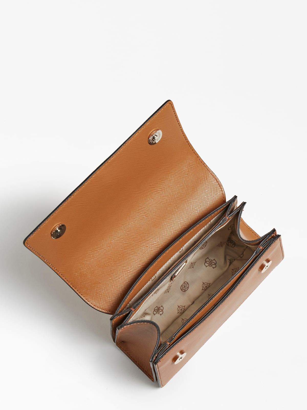 Sac porté croisé avec sa bandoulière réglable et amovible est réalisé dans une belle toile enduite aspect Iguane. Il présente la plaque triangle signature Guess or pale de la marque ainsi qu'un porte-monnaie.