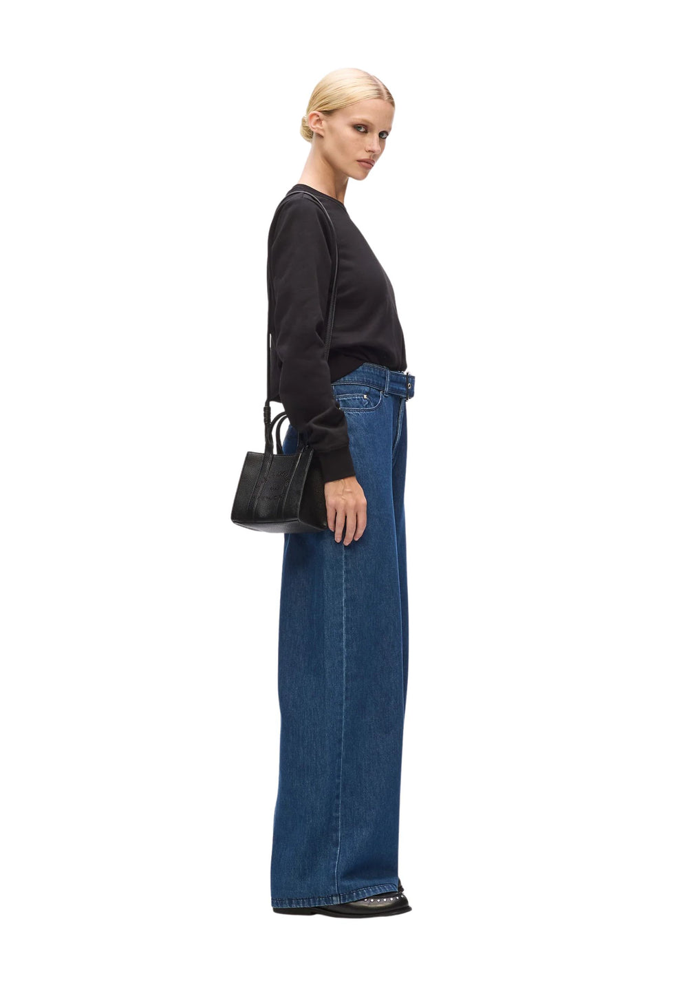• Cremfarvet rullekrave + marineblå habitbukser + nude pumps