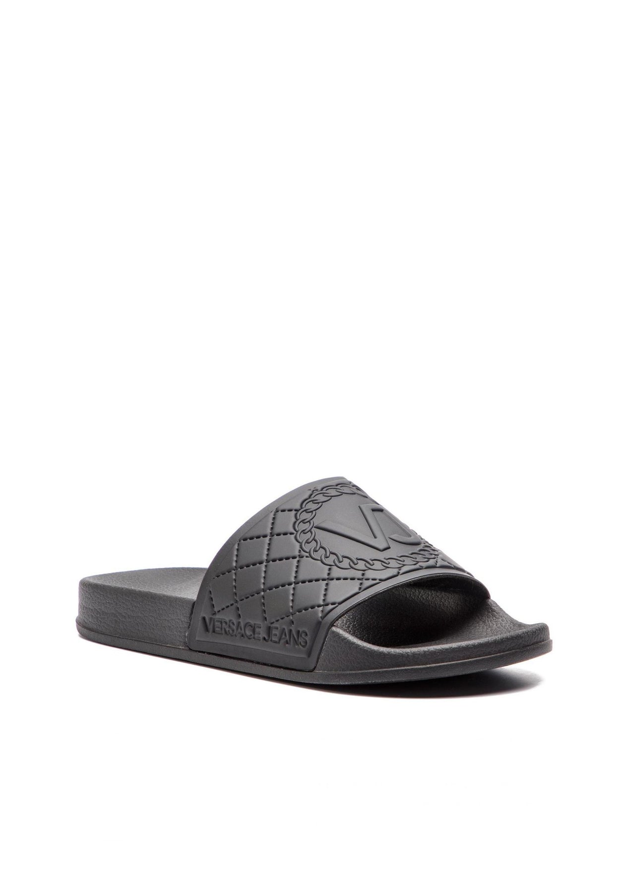 Claquettes Versace Jeans E0VTBSQ4 en caoutchouc premium, Semelles intérieures moulées pour un confort optimal à la piscine ou à la plage. Design moderne avec logo gravé et lanière robuste. Pointure 39. Authentique et durable, ces sandales de luxe allient style italien et fonctionnalité.
