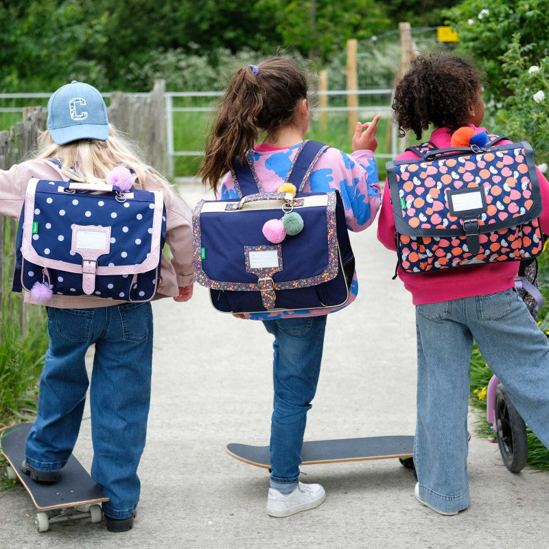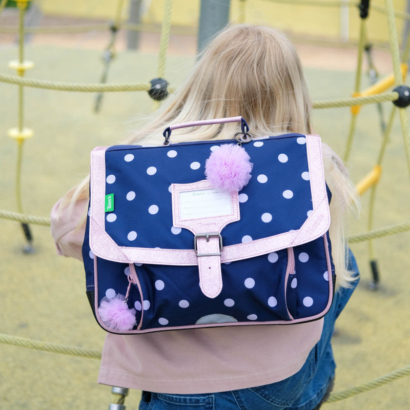 La cartella Romy trasforma il ritorno a scuola in un momento magico con il suo design blu navy a pois lilla valorizzato da un bordo glitterato rosa. Il suo grazioso portachiavi pompon in tulle richiama l'universo delle ballerine, portando dolcezza e fantasia nella quotidianità scolastica.