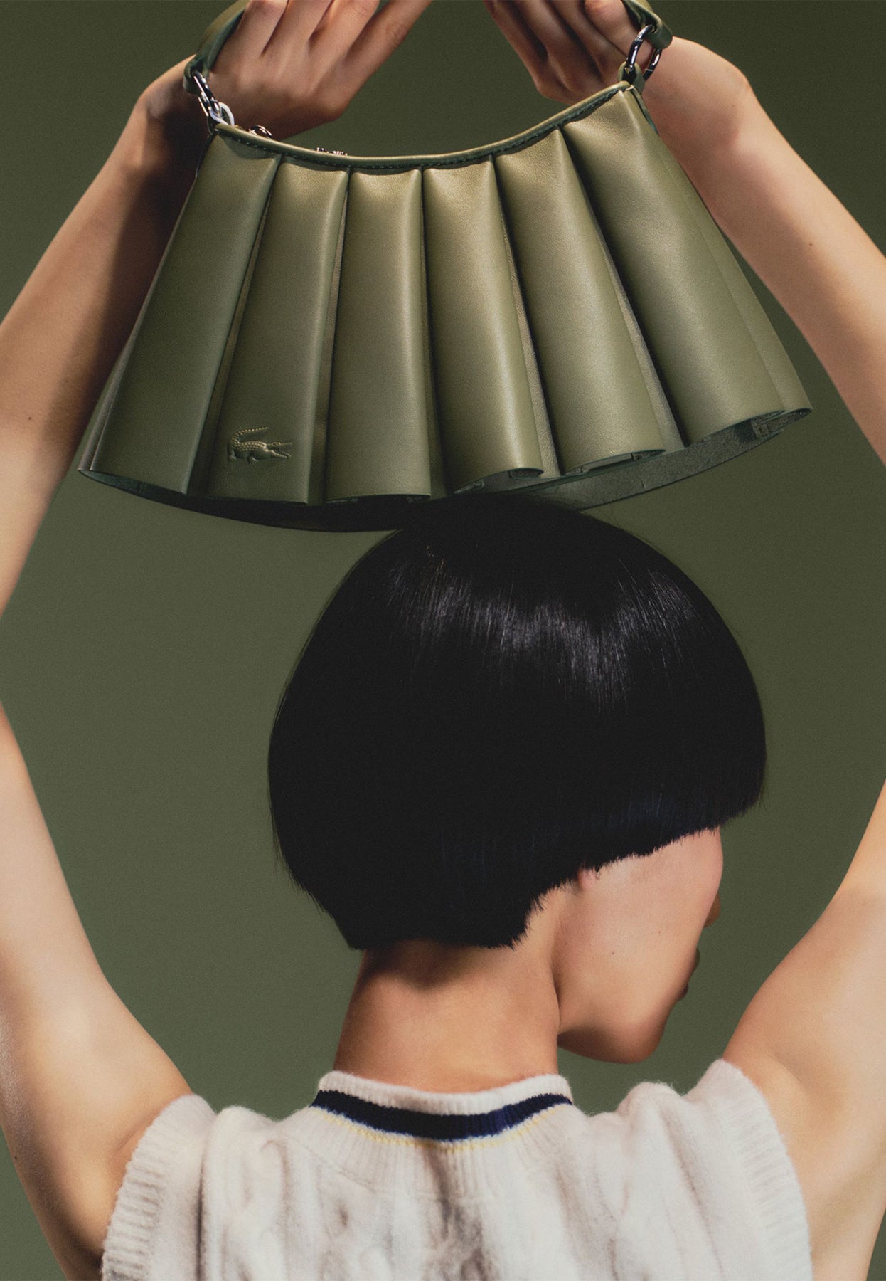 Le plissé caractéristique rend hommage aux jupes de tennis iconiques, tandis que le crocodile embossé affirme l'authenticité Lacoste. Cette approche design unique transforme un détail sportif historique en élément de style contemporain, créant un accessoire qui raconte une histoire.